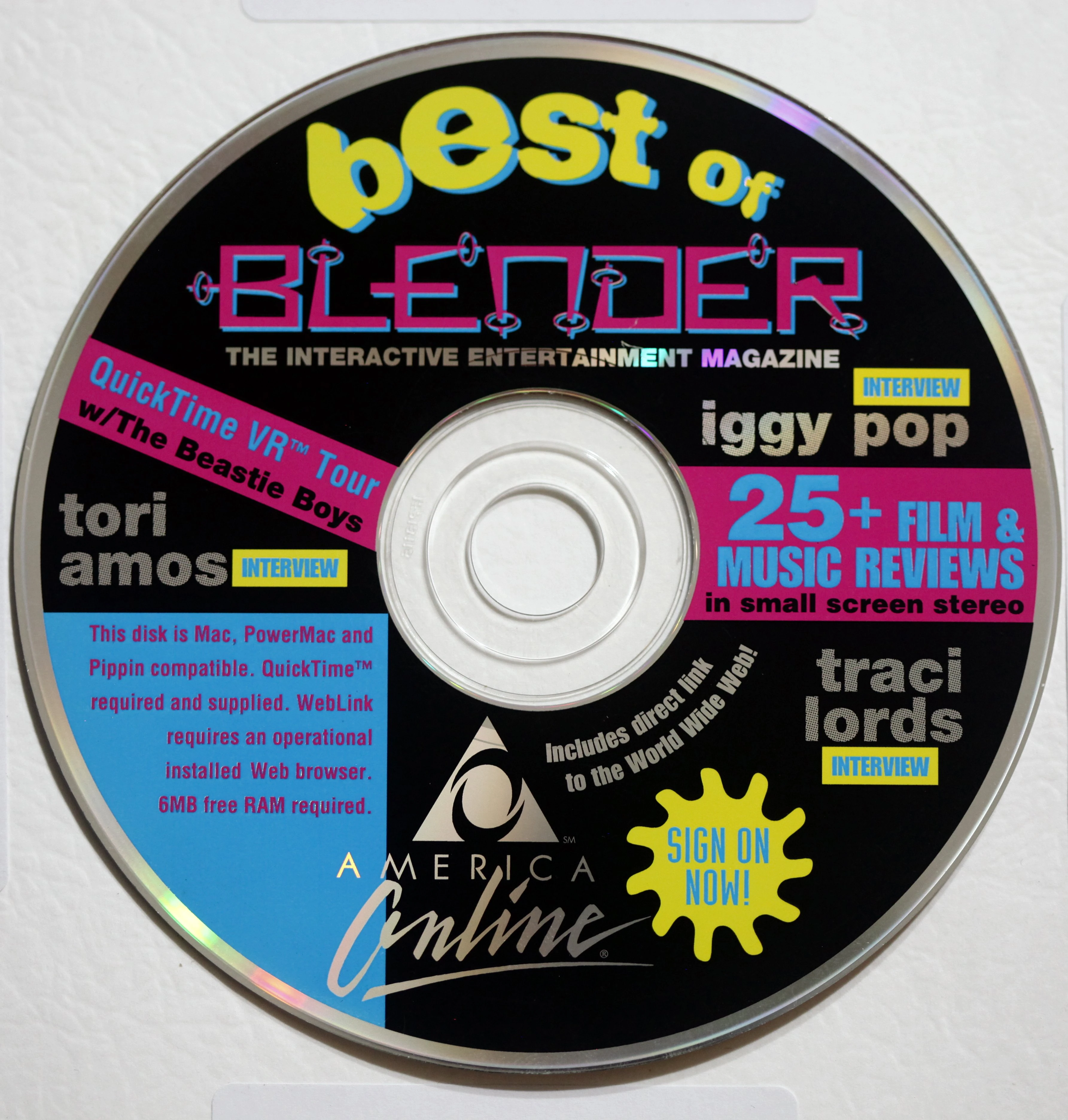 The Best of Blender CD-ROM is a digital compilation of content from Blender magazine, containing interviews with Iggy Pop, Tori Amos, and Traci Lords. It also included a QuickTime VR tour with The Beastie Boys, a copy of America Online, and over 25 film and music reviews.