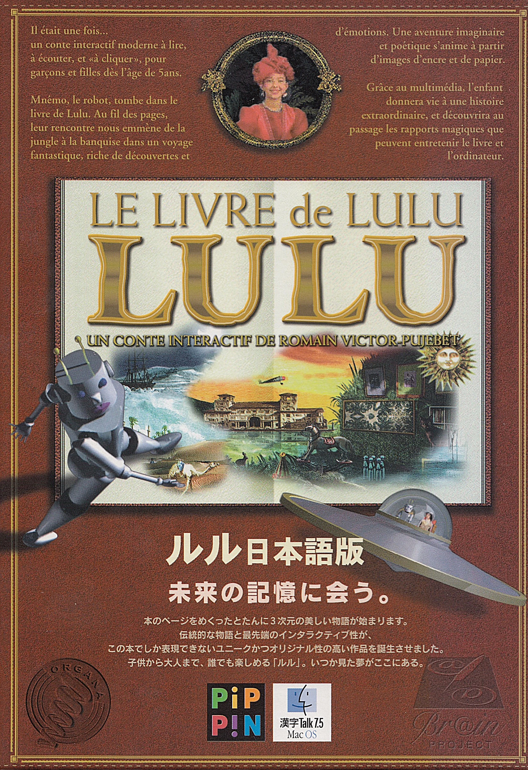 Le Livre de Lulu: Un Conte Interactif de Romain Victor-Pujebet is a children's book presented on a CD-ROM for the Pippin Atmark console.[1] The French title translates to "The Book of Lulu: An Interactive Story by Romain Victor-Pujebet". The Japanese title and tagline 「ルル日本語版 未来の記憶に会う。」 translate to "Lulu Japanese version: Meet the memories of the future."